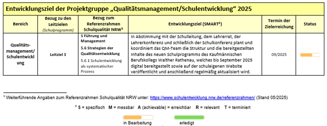 Die Schulleitung mit der Erweiterten Schul-leitung, die Bildungsgangkonferenzen und Fachkonferenzen sowie die Lehrerkonferenz arbeiten hierbei eng zusammen, um Prioritäten zu setzen und die Schulqualität nachhaltig zu verbessern.