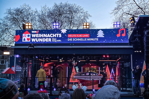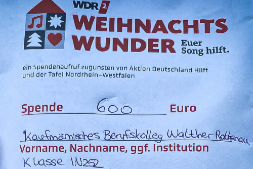 Nach Wochen voller Backen, Verkaufen und Organisieren – und drei richtig erfolgreichen Spendenverkaufstagen in der Schule – haben die Schülerinnen und Schüler der IN252 gemeinsam mit ihrer Klassenlehrerin Frau Risse eine stolze Summe von 600 Euro beim „WDR 2 Weihnachtswunder“ auf dem Burgplatz in Essen übergeben.